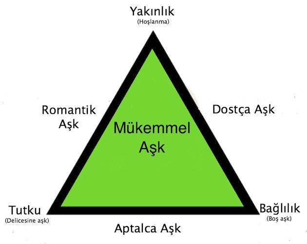 Robert Sternberg’e göre aşk üç bileşene ayrılmaktadır ve aşkı anlamının en kolay yolu onu üçgen olarak ele almaktır. Yakınlık, tutku ve bağlılık üçgenin köşeleridir. Bununla birlikte çiftlerin yaşayabileceği yedi farklı kombinasyona ulaşılmaktadır. Yedi farklı kombinasyonu üçgenin köşeleri arasındaki bağlantılar olarak hayal edebilirsiniz.